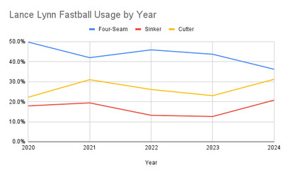 I will start with a discussion of fastball usage because it’s relevant to my overall point, which is that Lance Lynn just keeps tweaking. This shouldn’t be surprising either. Pitchers generally like to make tweaks after having a season like Lynn had in 2023.