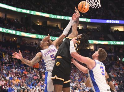 Florida guard Will Richard (5) blocks Missouri center Josh Gray (33) during the first half of an SEC Tournament quarterfinal game against Florida on Thursday, March 11, 2025, at Bridgestone Arena in Nashville, Tenn. (CAL TOBIAS/ROCK M)