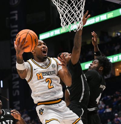 Missouri guard Tamar Bates (2) lays up the ball during the first half of an SEC Tournament second round game against Mississippi State on Thursday, March 11, 2025, at Bridgestone Arena in Nashville, Tenn. (CAL TOBIAS/ROCK M)